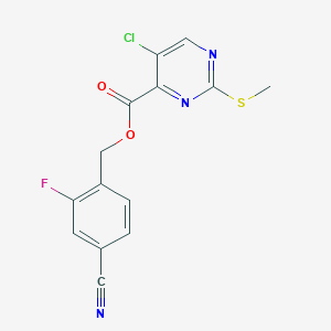 The synthesis of (4-Cyano-2-fluorophenyl)methyl 5-chloro-2-(methylsulfanyl)pyrimidine-4-carboxylate typically involves multi-step organic reactions. One common approach includes the following steps: