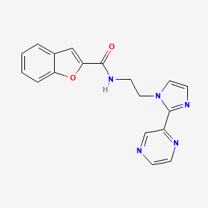 The synthesis of N-(2-(2-(pyrazin-2-yl)-1H-imidazol-1-yl)ethyl)benzofuran-2-carboxamide typically involves multi-step organic reactions. One common approach is the condensation reaction of aromatic ketones with benzofuran derivatives in the presence of a base such as sodium alkoxide . The reaction conditions often require controlled temperatures and inert atmospheres to prevent unwanted side reactions.