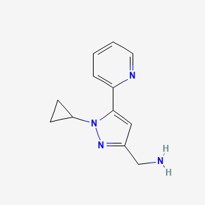 The synthesis of (1-Cyclopropyl-5-(pyridin-2-YL)-1H-pyrazol-3-YL)methanamine typically involves multi-step organic reactions. One common approach is to start with the cyclopropylamine, which undergoes a series of reactions to introduce the pyridine and pyrazole rings. The reaction conditions often involve the use of catalysts, solvents, and controlled temperatures to ensure the desired product is obtained with high purity and yield.