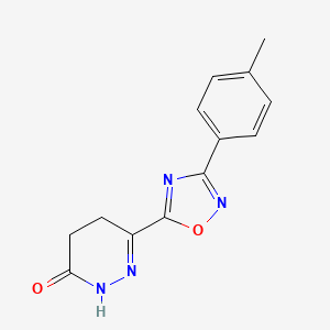 The mechanism of action of 6-(3-(p-Tolyl)-1,2,4-oxadiazol-5-yl)-4,5-dihydropyridazin-3(2H)-one involves its interaction with specific molecular targets and pathways. The compound’s bioisosteric properties allow it to mimic the behavior of other biologically active molecules, potentially inhibiting enzymes or interacting with receptors in the body . The exact molecular targets and pathways depend on the specific biological activity being investigated.
