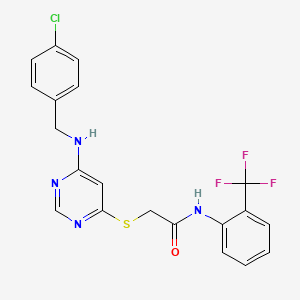 The compound 2-({6-[(4-chlorobenzyl)amino]pyrimidin-4-yl}sulfanyl)-N-[2-(trifluoromethyl)phenyl]acetamide is a novel molecule that has garnered attention for its potential biological activities, particularly in the fields of oncology and antimicrobial research. This article reviews the available literature on its biological activity, including structure-activity relationships (SAR), mechanisms of action, and specific case studies.