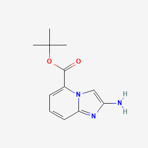 The synthesis of tert-butyl 2-aminoimidazo[1,2-a]pyridine-5-carboxylate typically involves multi-step reactions starting from readily available precursors. One common method involves the cyclization of a suitable precursor under acidic or basic conditions to form the imidazo[1,2-a]pyridine core. The tert-butyl ester group is then introduced through esterification reactions.