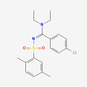 (E)-4-chloro-N’-((2,5-dimethylphenyl)sulfonyl)-N,N-diethylbenzimidamide is a synthetic organic compound that belongs to the class of benzimidamides. These compounds are known for their diverse applications in various fields, including medicinal chemistry, agricultural chemistry, and materials science. The presence of a sulfonyl group and a chloro substituent in the structure suggests potential biological activity and reactivity.