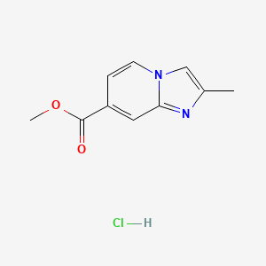 Methyl 2-methylimidazo[1,2-a]pyridine-7-carboxylate;hydrochloride is a compound belonging to the imidazo[1,2-a]pyridine class, which is known for its wide range of applications in medicinal chemistry. This compound is characterized by a fused bicyclic structure that includes both imidazole and pyridine rings. The presence of a carboxylate group and a methyl group on the imidazo[1,2-a]pyridine core enhances its chemical reactivity and potential biological activity.