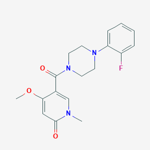 The synthesis of 5-(4-(2-fluorophenyl)piperazine-1-carbonyl)-4-methoxy-1-methylpyridin-2(1H)-one typically involves multiple steps, starting with the preparation of the piperazine ring. One common method involves the use of a palladium-catalyzed cyclization reaction, which couples a propargyl unit with various diamine components to yield the desired piperazine structure . The fluorophenyl group can be introduced via a nucleophilic aromatic substitution reaction, using a fluorinated benzene derivative as the starting material .