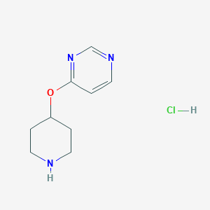 4-(Piperidin-4-yloxy)pyrimidine hydrochloride is a chemical compound with the molecular formula C9H14ClN3O. It is a derivative of piperidine and pyrimidine, two important heterocyclic compounds. This compound is of significant interest in the field of medicinal chemistry due to its potential pharmacological properties and applications in drug discovery .