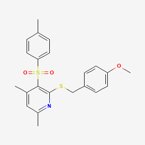 The compound features a pyridine core substituted with methyl groups at positions 4 and 6, a 4-methoxybenzylsulfanyl moiety at position 2, and a 4-methylphenyl sulfone group at position 3. The sulfone group ($$-\text{SO}_2-$$) enhances electrophilicity, making the molecule suitable for further functionalization.