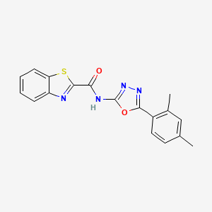The synthesis of N-[5-(2,4-dimethylphenyl)-1,3,4-oxadiazol-2-yl]-1,3-benzothiazole-2-carboxamide typically involves the formation of the oxadiazole ring followed by its coupling with the benzo[d]thiazole moiety. One common method involves the cyclization of a hydrazide with a carboxylic acid derivative under dehydrating conditions to form the oxadiazole ring . This intermediate is then reacted with a benzo[d]thiazole derivative under appropriate conditions to yield the final product .