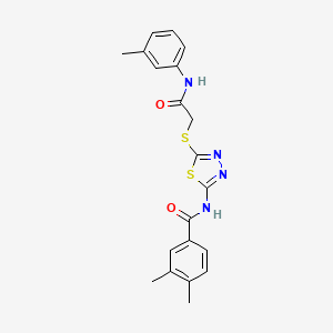 3,4-Dimethyl-N-(5-((2-oxo-2-(m-tolylamino)ethyl)thio)-1,3,4-thiadiazol-2-yl)benzamide is a synthetic compound belonging to the thiadiazole family. This compound has garnered attention due to its potential biological activities, particularly in the fields of medicinal chemistry and pharmacology. Its complex structure includes a thiadiazole ring and various functional groups, which contribute to its biological effects.