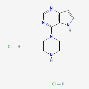 1-{5H-pyrrolo[3,2-d]pyrimidin-4-yl}piperazine dihydrochloride undergoes various chemical reactions, including oxidation, reduction, and substitution. Common reagents used in these reactions include oxidizing agents like oxone and reducing agents such as sodium borohydride. The compound can also participate in substitution reactions with halogenated compounds. Major products formed from these reactions depend on the specific reagents and conditions used, but they often include derivatives with modified functional groups that enhance or alter the compound’s biological activity .