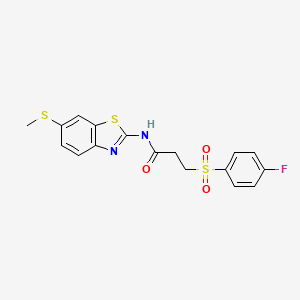 The synthesis of 3-((4-fluorophenyl)sulfonyl)-N-(6-(methylthio)benzo[d]thiazol-2-yl)propanamide typically involves multi-step organic reactions. One common approach is to start with the preparation of the benzo[d]thiazolyl intermediate, followed by the introduction of the sulfonyl and fluorophenyl groups. The reaction conditions often require the use of catalysts, solvents, and specific temperature controls to ensure the desired product is obtained with high purity and yield.