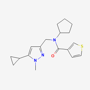 N-cyclopentyl-N-((5-cyclopropyl-1-methyl-1H-pyrazol-3-yl)methyl)thiophene-3-carboxamide is a complex organic compound that has garnered attention in pharmacological research due to its potential biological activities. This article explores its synthesis, biological mechanisms, and therapeutic applications, supported by relevant data and case studies.