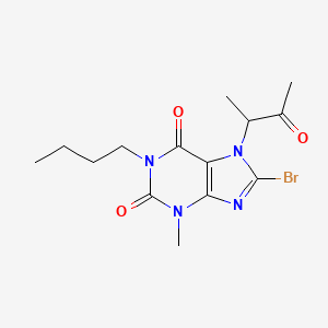 8-Bromo-1-butyl-3-methyl-7-(3-oxobutan-2-yl)-1H-purine-2,6(3H,7H)-dione is a synthetic organic compound belonging to the purine family. This compound is characterized by its unique chemical structure, which includes a bromine atom, a butyl group, a methyl group, and an oxobutan-2-yl group attached to the purine core. Its molecular formula is with a molecular weight of approximately 371.23 g/mol.