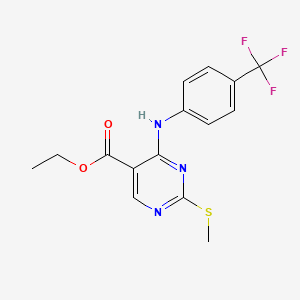 Ethyl 2-(methylsulfanyl)-4-[4-(trifluoromethyl)anilino]-5-pyrimidinecarboxylate is a complex organic compound that belongs to the class of pyrimidine derivatives This compound is characterized by the presence of a trifluoromethyl group attached to an aniline moiety, a methylsulfanyl group, and an ethyl ester group