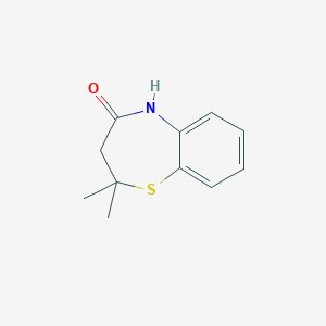 2,3-Dihydro-2,2-dimethyl-1,5-benzothiazepin-4(5H)-one is a heterocyclic compound featuring a seven-membered benzothiazepine ring fused with a benzene ring. Its core structure includes a thiazepinone moiety (a sulfur and nitrogen-containing ring) with two methyl groups at the 2-position (C2), contributing to its stereochemical rigidity and lipophilicity. This compound belongs to the 1,5-benzothiazepin-4(5H)-one class, which has garnered attention for diverse pharmacological activities, including antidepressant and cardiovascular effects .