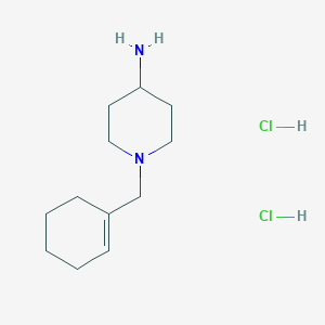 1-[(Cyclohex-1-en-1-yl)methyl]piperidin-4-amine dihydrochloride is a piperidine derivative featuring a cyclohexene-substituted methyl group at the 1-position of the piperidine ring and an amine group at the 4-position. The dihydrochloride salt enhances its solubility and stability, making it suitable for pharmaceutical and biochemical research . Piperidine derivatives are widely studied for their conformational flexibility and ability to interact with biological targets, such as receptors and enzymes. The cyclohexene moiety introduces unsaturation, which may influence electronic properties and molecular rigidity compared to saturated cycloalkyl analogs .