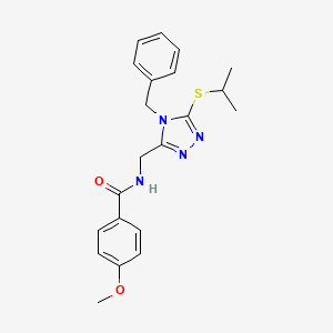 The synthesis of N-((4-benzyl-5-(isopropylthio)-4H-1,2,4-triazol-3-yl)methyl)-4-methoxybenzamide typically involves multiple steps. One common synthetic route starts with the preparation of the triazole ring, followed by the introduction of the benzyl and isopropylthio groups. The final step involves the attachment of the 4-methoxybenzamide moiety. The reaction conditions often include the use of solvents like dimethyl sulfoxide (DMSO) and catalysts such as triethylamine .