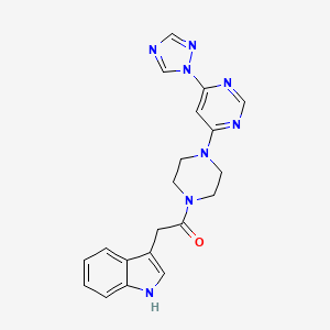 This compound is a heterocyclic molecule featuring a pyrimidine core substituted with a 1,2,4-triazole ring, linked to a piperazine moiety and an indole-3-yl ethanone group. The pyrimidine-piperazine backbone is frequently utilized in medicinal chemistry for its ability to engage in hydrogen bonding and π-π stacking, which may enhance receptor binding affinity .