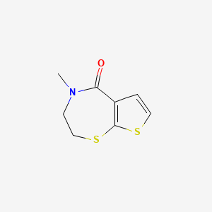 4-Methyl-2H,3H,4H,5H-thieno[3,2-f][1,4]thiazepin-5-one is a heterocyclic compound that has garnered attention due to its potential biological activities. This compound features a unique thieno-thiazepine structure characterized by the presence of sulfur and nitrogen atoms within its fused ring system. The molecular formula is with a molar mass of approximately 199.29 g/mol. This article reviews the biological activities associated with this compound, including its pharmacological properties, mechanisms of action, and potential therapeutic applications.
