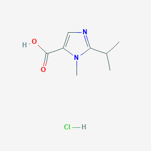 3-Methyl-2-propan-2-ylimidazole-4-carboxylic acid; hydrochloride is a heterocyclic organic compound featuring an imidazole core substituted with methyl and isopropyl groups at positions 3 and 2, respectively, and a carboxylic acid moiety at position 4, stabilized as a hydrochloride salt. The imidazole ring is a pharmacologically relevant scaffold due to its role in hydrogen bonding and metabolic stability, while the hydrochloride salt enhances aqueous solubility and bioavailability. This compound is structurally analogous to bioactive molecules targeting enzymes or receptors, though its specific applications remain understudied in the provided evidence .
