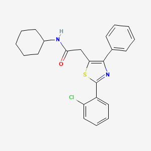 2-[2-(2-Chlorophenyl)-4-phenyl-1,3-thiazol-5-yl]-N-cyclohexylacetamide is a thiazole-derived compound featuring a 1,3-thiazol-5-yl core substituted with a 2-chlorophenyl group at position 2, a phenyl group at position 4, and an N-cyclohexylacetamide moiety at position 5. Thiazole derivatives are widely studied for their diverse biological activities and physicochemical properties, often attributed to the electron-rich sulfur and nitrogen atoms in the heterocyclic ring.