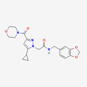 N-(benzo[d][1,3]dioxol-5-ylmethyl)-2-(5-cyclopropyl-3-(morpholine-4-carbonyl)-1H-pyrazol-1-yl)acetamide is a synthetic small molecule characterized by a benzodioxole moiety linked to a pyrazole-acetamide scaffold. The benzodioxole group (benzo[d][1,3]dioxol-5-ylmethyl) is a common pharmacophore in medicinal chemistry due to its metabolic stability and ability to engage in π-π interactions with biological targets . The pyrazole core (5-cyclopropyl-3-(morpholine-4-carbonyl)-1H-pyrazole) is substituted with a cyclopropyl group and a morpholine-4-carbonyl moiety, which enhance steric bulk and modulate solubility and target binding . While direct data on this compound’s synthesis or activity is absent in the provided evidence, structurally related analogs (e.g., thiazole- and pyrazole-based derivatives) suggest its relevance in drug discovery for neurological or oncological targets .