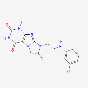 8-(2-((3-Chlorophenyl)amino)ethyl)-1,7-dimethyl-1H-imidazo[2,1-f]purine-2,4(3H,8H)-dione (molecular formula: C₁₉H₂₁ClN₆O₂; molecular weight: 400.87 g/mol) is a synthetic purine derivative characterized by a 1H-imidazo[2,1-f]purine-2,4(3H,8H)-dione core substituted with a 3-chlorophenylaminoethyl side chain at the 8-position and methyl groups at the 1- and 7-positions . Its structural design incorporates a chlorinated aryl group, which may enhance receptor binding specificity compared to non-halogenated analogs .