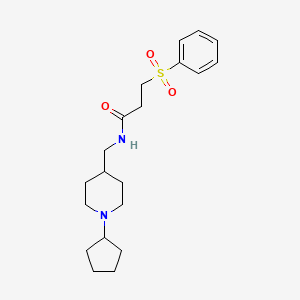 The synthesis of 3-(benzenesulfonyl)-N-[(1-cyclopentylpiperidin-4-yl)methyl]propanamide typically involves multiple steps, starting with the preparation of benzenesulfonyl chloride. Benzenesulfonyl chloride can be synthesized by reacting benzenesulfonic acid or its salts with phosphorus pentachloride or phosphorus oxychloride . The resulting benzenesulfonyl chloride is then reacted with N-[(1-cyclopentylpiperidin-4-yl)methyl]propanamide under controlled conditions to form the final product.