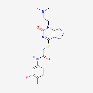 The synthesis of 2-({1-[2-(dimethylamino)ethyl]-2-oxo-1H,2H,5H,6H,7H-cyclopenta[d]pyrimidin-4-yl}sulfanyl)-N-(3-fluoro-4-methylphenyl)acetamide involves multiple steps, including the formation of the cyclopenta[d]pyrimidinyl core and the subsequent attachment of the dimethylaminoethyl and fluoro-methylphenylacetamide groups. Specific reaction conditions, such as temperature, solvents, and catalysts, are crucial for the successful synthesis of this compound .