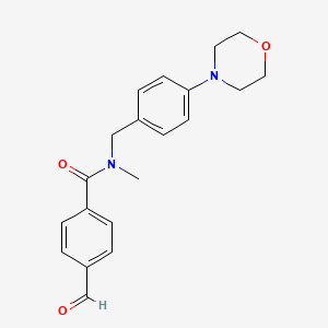 The synthesis of 4-formyl-N-methyl-N-[(4-morpholin-4-ylphenyl)methyl]benzamide typically involves multi-step organic reactions. One common method includes the reaction of 4-formylmorpholine with N-methyl-N-[(4-morpholin-4-ylphenyl)methyl]amine under controlled conditions. The reaction is usually carried out in the presence of a suitable solvent and a catalyst to facilitate the formation of the desired product .