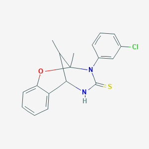 The synthesis of 3-(3-chlorophenyl)-2,11-dimethyl-2,3,5,6-tetrahydro-4H-2,6-methano-1,3,5-benzoxadiazocine-4-thione typically involves multiple steps, starting from readily available precursors. One common method involves the cyclization of appropriate intermediates under controlled conditions. For example, the reaction of 3-chloroaniline with suitable aldehydes or ketones, followed by cyclization and introduction of the thione group, can yield the desired compound. The reaction conditions often require the use of catalysts, solvents, and specific temperature and pressure settings to ensure high yield and purity.