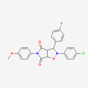 The synthesis of 2-(4-chlorophenyl)-3-(4-fluorophenyl)-5-(4-methoxyphenyl)-hexahydro-2H-pyrrolo[3,4-d][1,2]oxazole-4,6-dione typically involves multi-step organic reactions. The process begins with the preparation of the individual phenyl groups, followed by their incorporation into the pyrrolo[3,4-d][1,2]oxazole core. Common reagents used in these reactions include chlorinating agents, fluorinating agents, and methoxylating agents under controlled conditions of temperature and pressure.