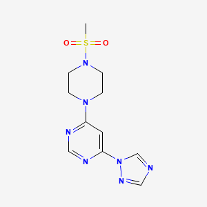 The synthesis of 4-(4-(methylsulfonyl)piperazin-1-yl)-6-(1H-1,2,4-triazol-1-yl)pyrimidine typically involves multi-step organic reactions. One common synthetic route starts with the preparation of the piperazine derivative, which is then reacted with a methylsulfonyl chloride under basic conditions to introduce the methylsulfonyl group. The resulting intermediate is then subjected to a nucleophilic substitution reaction with a triazole derivative to form the final product. The reaction conditions often involve the use of solvents such as dichloromethane or dimethylformamide and catalysts like triethylamine.