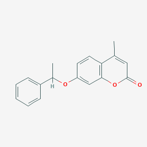 The synthesis of 4-methyl-7-(1-phenylethoxy)-2H-chromen-2-one can be achieved through various synthetic routes. One common method involves the alkylation of 7-hydroxy-4-methyl-2H-chromen-2-one with 1-phenylethanol under reflux conditions. The reaction typically requires a base such as potassium carbonate and a solvent like acetone. The reaction mixture is heated to around 50°C to facilitate the alkylation process.