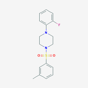 The mechanism of action of 1-(2-Fluorophenyl)-4-(m-tolylsulfonyl)piperazine involves its interaction with specific molecular targets and pathways. The fluorophenyl group and the tolylsulfonyl group contribute to its binding affinity and selectivity towards certain enzymes or receptors. The compound may inhibit or activate these targets, leading to various biological effects. Detailed studies on its molecular interactions and pathways are essential to fully understand its mechanism of action.