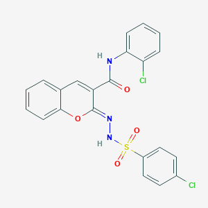 The synthesis of (2Z)-2-[(4-chlorobenzenesulfonamido)imino]-N-(2-chlorophenyl)-2H-chromene-3-carboxamide typically involves multi-step organic reactions. One common method includes the condensation of 4-chlorobenzenesulfonamide with 2-chlorobenzaldehyde under acidic conditions to form an intermediate Schiff base. This intermediate is then cyclized with a suitable chromene derivative in the presence of a base to yield the final product. The reaction conditions often require controlled temperatures and inert atmospheres to prevent side reactions.