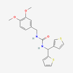 Synthetic Routes and Reaction Conditions: The synthesis of 1-(3,4-Dimethoxybenzyl)-3-(thiophen-2-yl(thiophen-3-yl)methyl)urea typically involves multi-step organic reactions. One common method starts with the preparation of the intermediate 3,4-dimethoxybenzylamine, which is then reacted with thiophene derivatives under controlled conditions to form the desired urea compound. The reaction conditions often include the use of solvents like dichloromethane or ethanol, and catalysts such as triethylamine or pyridine to facilitate the reaction.