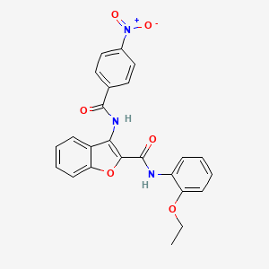 The mechanism of action of N-(2-ethoxyphenyl)-3-(4-nitrobenzamido)benzofuran-2-carboxamide involves its interaction with specific molecular targets, such as enzymes or receptors. The nitrobenzamido group is known to participate in hydrogen bonding and electrostatic interactions, which can modulate the activity of target proteins. The benzofuran core may interact with hydrophobic pockets within proteins, enhancing binding affinity and specificity.