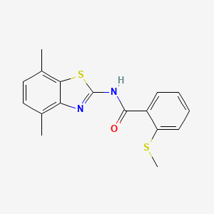 N-(4,7-dimethylbenzo[d]thiazol-2-yl)-2-(methylthio)benzamide is a benzothiazole derivative that has garnered attention for its potential biological activities. This compound is characterized by its unique structural features, which include a benzothiazole core and methylthio substitution. These attributes may contribute to its interactions with various biological targets, making it a subject of interest in medicinal chemistry.