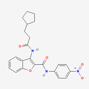 The mechanism of action of 3-(3-cyclopentylpropanamido)-N-(4-nitrophenyl)benzofuran-2-carboxamide depends on its specific application and target. In biological systems, the compound may interact with specific molecular targets, such as enzymes, receptors, or DNA, to exert its effects. The pathways involved may include inhibition of enzyme activity, modulation of receptor signaling, or interference with DNA replication and transcription.