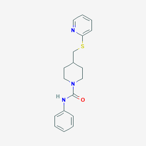 The mechanism of action of N-phenyl-4-((pyridin-2-ylthio)methyl)piperidine-1-carboxamide involves its interaction with specific molecular targets and pathways. The compound may bind to enzymes or receptors, modulating their activity and leading to various biological effects . For example, it may inhibit certain enzymes involved in inflammation or cancer progression .