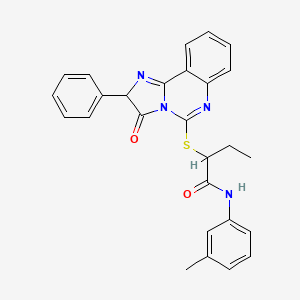 Chemical Structure and Key Features The compound features a fused imidazo[1,2-c]quinazolinone core with a 3-oxo group at position 3 and a phenyl substituent at position 2. A sulfanyl (-S-) bridge links the quinazolinone moiety to a butanamide chain, which terminates in an N-(3-methylphenyl) group. This structure combines a heterocyclic scaffold with sulfanyl and amide functionalities, making it a candidate for pharmacological exploration, particularly in targeting enzyme pathways or receptor interactions .