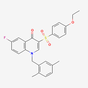 This compound is a quinolin-4-one derivative characterized by a 1,4-dihydroquinolin-4-one core substituted at the 1-position with a (2,5-dimethylphenyl)methyl group, at the 3-position with a 4-ethoxybenzenesulfonyl moiety, and at the 6-position with a fluorine atom. The 4-ethoxybenzenesulfonyl group may enhance metabolic stability and solubility compared to simpler sulfonamides, while the fluorine atom at position 6 likely influences electronic properties and binding affinity .