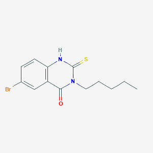 The synthesis of 6-Bromo-3-pentyl-2-sulfanyl-3,4-dihydroquinazolin-4-one typically involves the reaction of 6-bromo-2-aminobenzamide with pentyl isothiocyanate under appropriate conditions . The reaction is usually carried out in a suitable solvent such as ethanol or methanol, and the mixture is heated to reflux for several hours. After completion of the reaction, the product is isolated by filtration and purified by recrystallization.