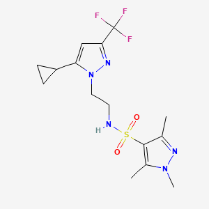 N-(2-(5-cyclopropyl-3-(trifluoromethyl)-1H-pyrazol-1-yl)ethyl)-1,3,5-trimethyl-1H-pyrazole-4-sulfonamide exerts its effects through interaction with specific molecular targets. The trifluoromethyl group and sulfonamide moiety play critical roles in its binding affinity and activity. These interactions can modulate biological pathways, leading to therapeutic effects in medicinal applications.