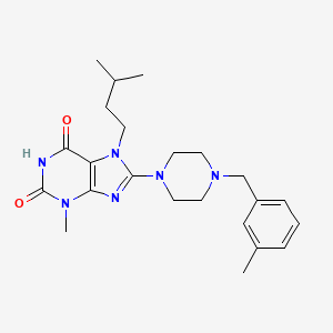 - Methodological Answer : The compound’s purine-2,6-dione core is substituted with a 3-methylbutyl group at position 7 and a 4-[(3-methylphenyl)methyl]piperazine moiety at position 7. To assess how these substituents affect physicochemical properties (e.g., solubility, logP), computational tools like quantum chemical calculations (e.g., DFT) can predict electronic and steric effects. Experimental validation via NMR and HPLC can confirm conformational stability . The piperazine group may enhance solubility through hydrogen bonding, while the methylphenyl group could influence lipophilicity and receptor interactions.
