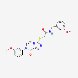 The compound 2-{[7-(3-methoxyphenyl)-8-oxo-7H,8H-[1,2,4]triazolo[4,3-a]pyrazin-3-yl]sulfanyl}-N-[(3-methoxyphenyl)methyl]acetamide is a member of the triazolopyrazine derivatives, which are recognized for their diverse biological activities. This article explores its biological activity, synthesis, and potential applications in medicinal chemistry.