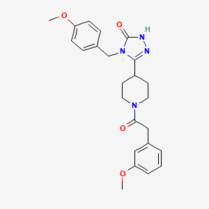 The mechanism of action of 3-{1-[2-(3-methoxyphenyl)acetyl]piperidin-4-yl}-4-[(4-methoxyphenyl)methyl]-4,5-dihydro-1H-1,2,4-triazol-5-one involves its interaction with specific molecular targets. The triazole ring can bind to enzymes and receptors, inhibiting their activity. The methoxybenzyl and methoxyphenyl groups may enhance the compound’s binding affinity and selectivity. The piperidine ring can interact with various biological pathways, modulating their function.