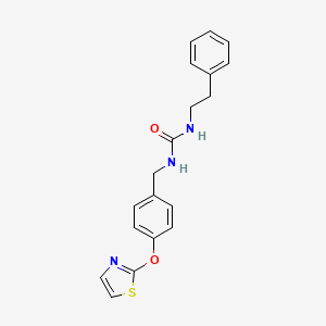 1-Phenethyl-3-(4-(thiazol-2-yloxy)benzyl)urea is a synthetic organic compound that has garnered attention in medicinal chemistry due to its diverse biological activities. This compound features a unique structural configuration that includes a phenethyl group, a thiazol-2-yloxy moiety, and a benzylurea core, which contribute to its potential therapeutic applications.