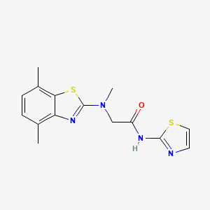 The synthesis of 2-((4,7-dimethylbenzo[d]thiazol-2-yl)(methyl)amino)-N-(thiazol-2-yl)acetamide typically involves multi-step organic reactions. One common approach is to start with the preparation of the benzo[d]thiazole core, followed by functionalization to introduce the dimethyl and methylamino groups. The final step involves the acylation with thiazol-2-yl acetamide under controlled conditions.